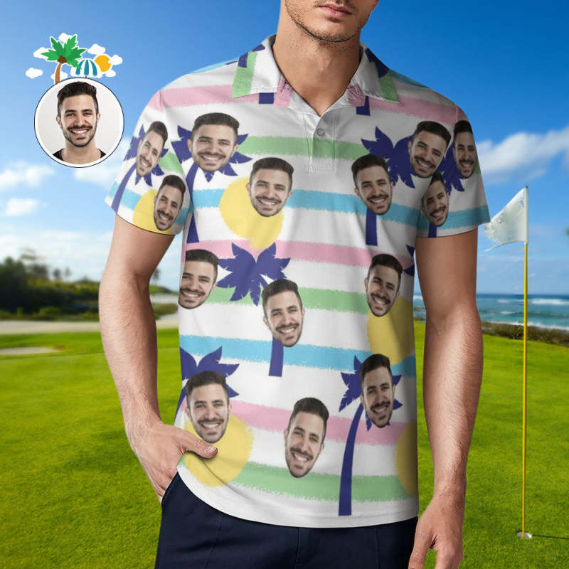 Custom Face Blue Palm Tree Polo Shirt For Men Personalized Hawaiian Golf Shirts