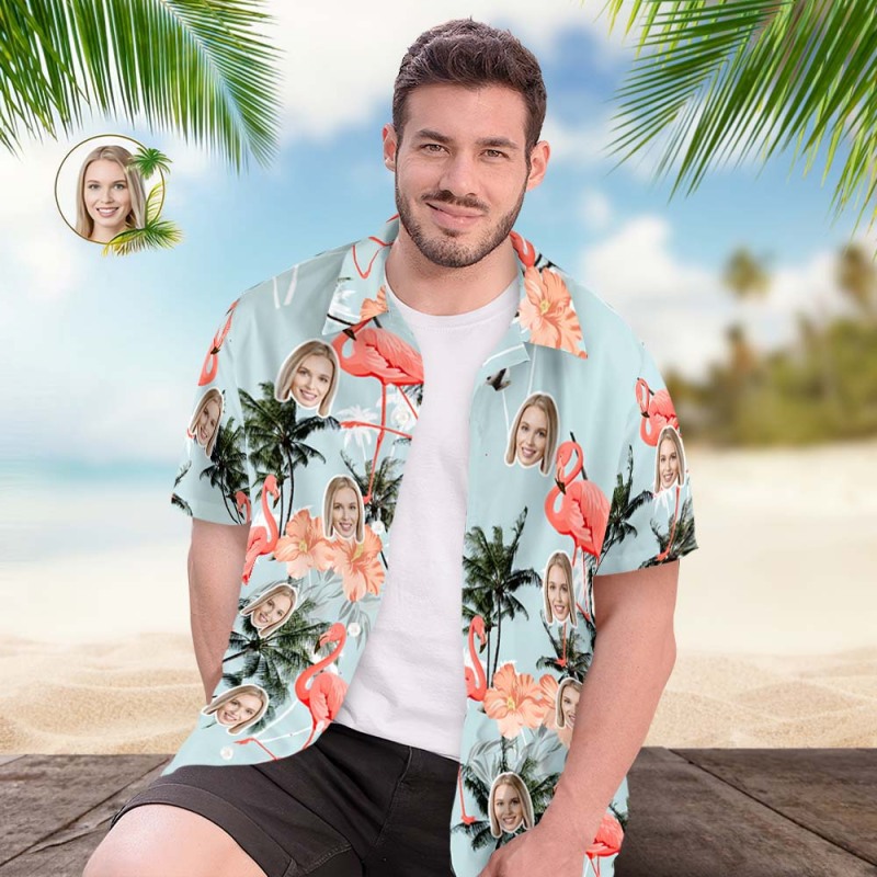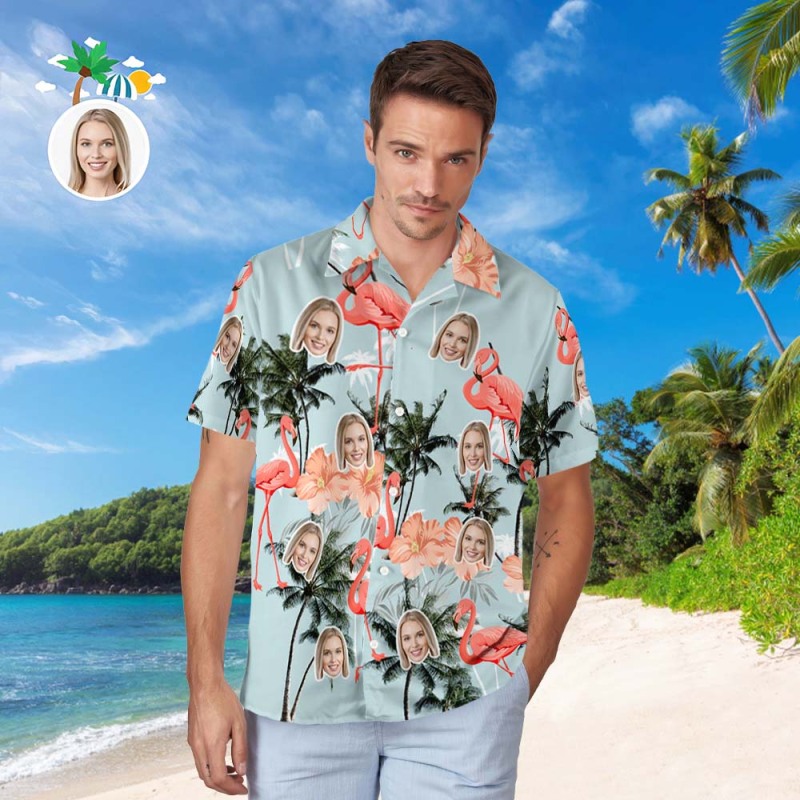 Custom Face Hawaiian Shirt Men's Popular All Over Print Hawaiian Beach Shirt Holiday Gift - Flamingos and Coconut Trees
