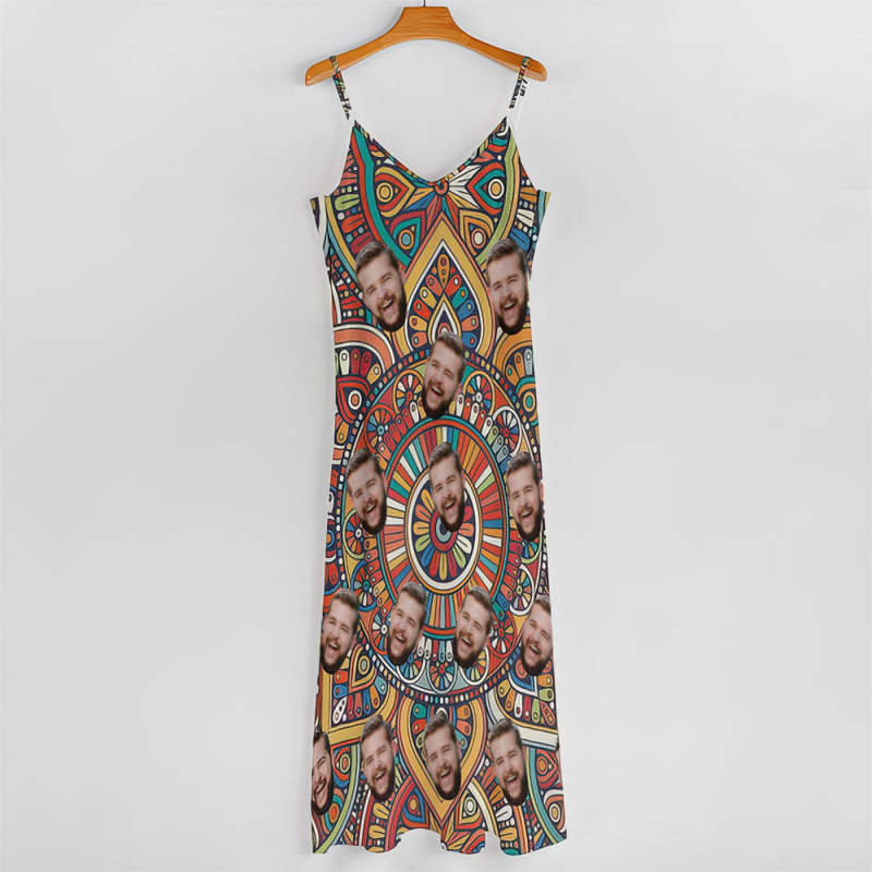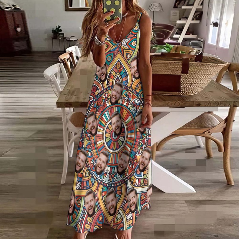 Custom Face Vintage Boho Dress Personalized Beach Dress Casual Loose Party Long Dress