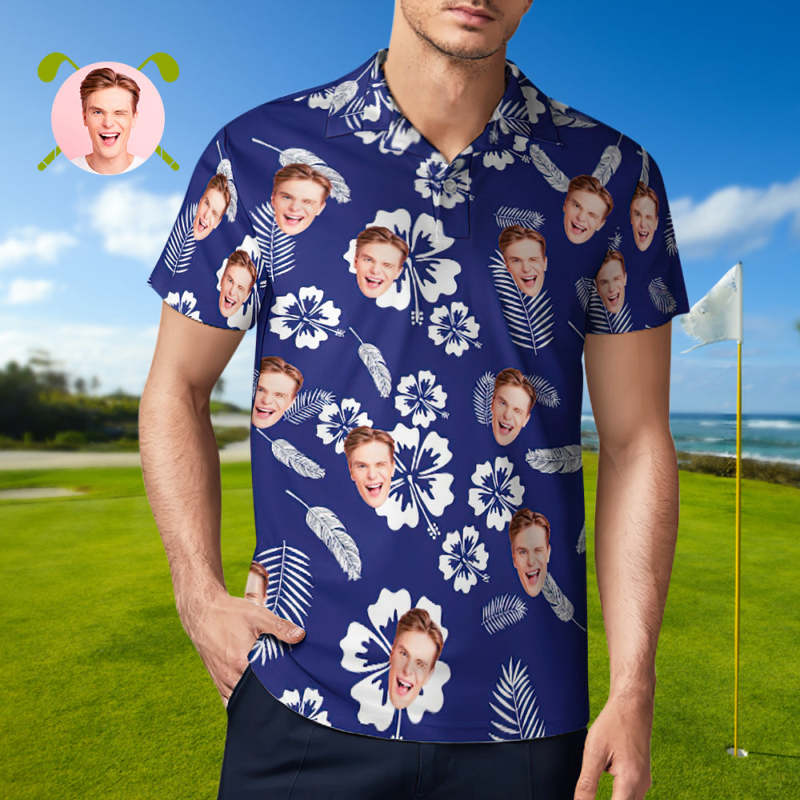 Men's Custom Face Polo Shirt Blue Tropical Vibe Personalized Hawaiian Golf Shirts Gift for Him
