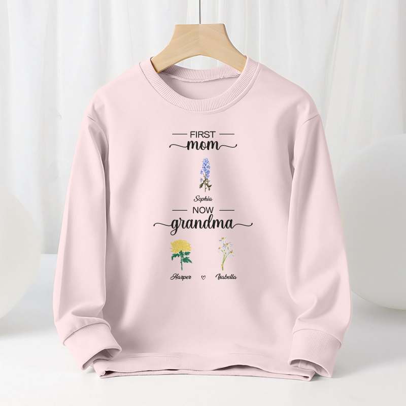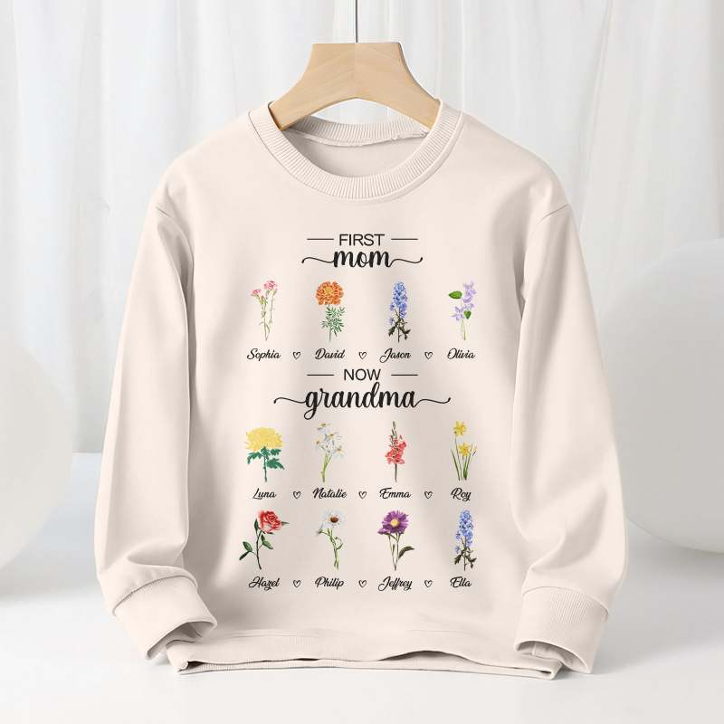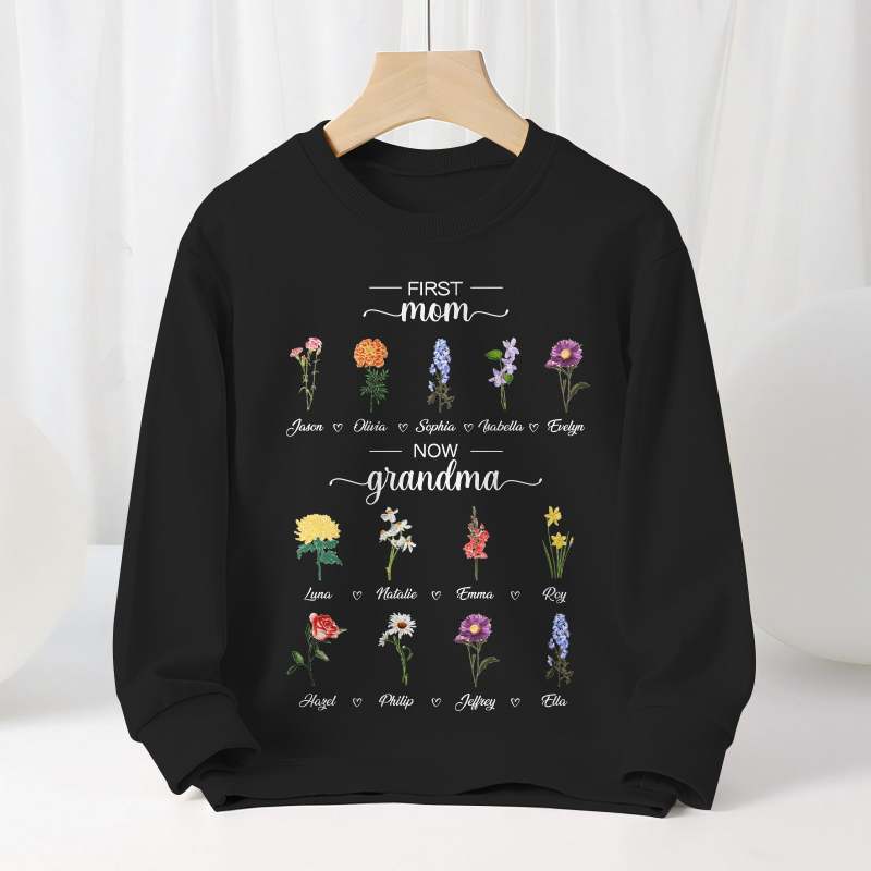 Personalized First Mom Now Grandma Sweatshirt Custom Birth Flowers Sweatshirts for Mother's Day Gift